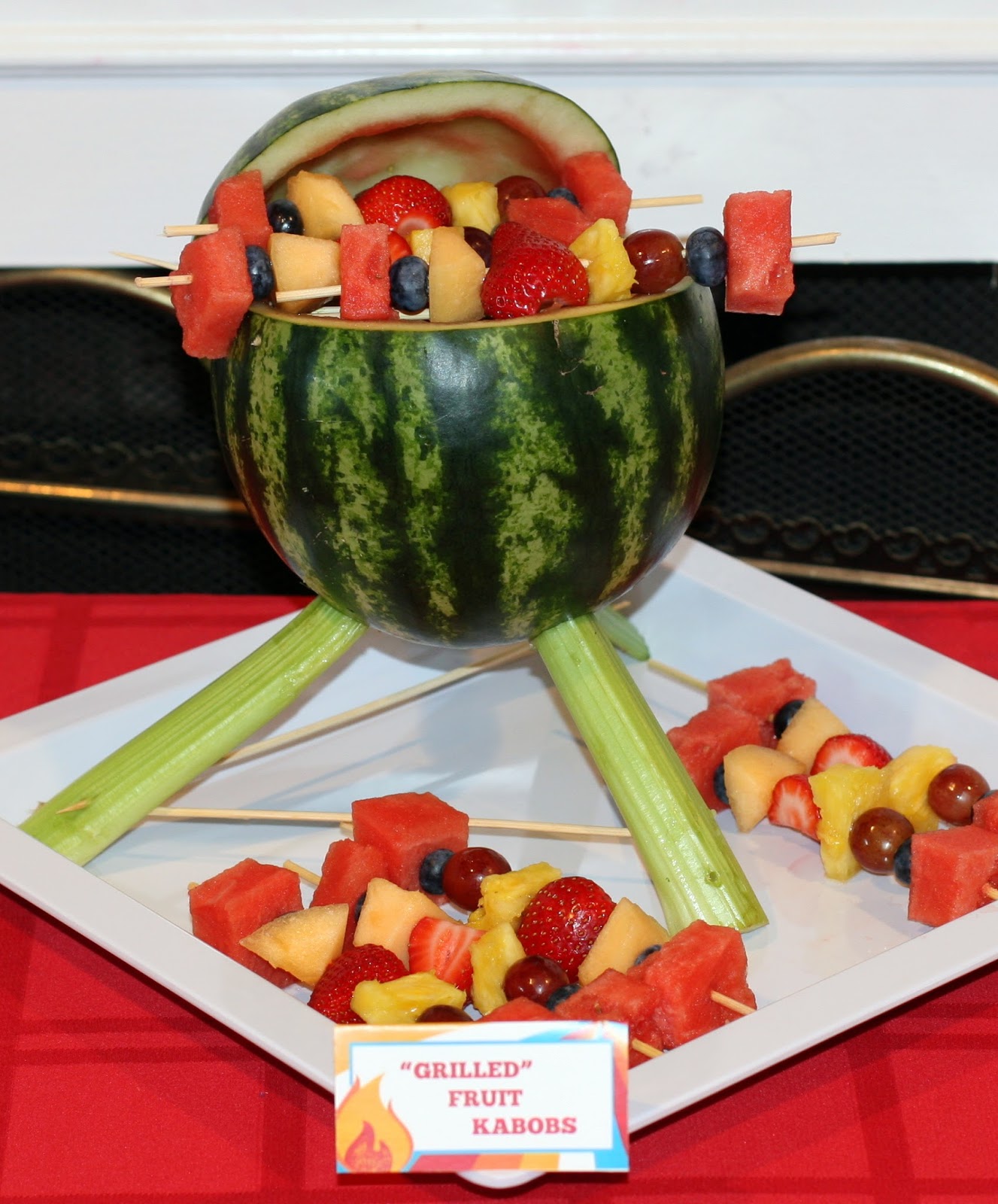 Inside the "grill" I placed blackberries to look like charcoal. For the lid of the "grill" I used a slice of cucumber hollowed out and attached it with toothpicks. There is a full tutorial on creating this fruit grill here.