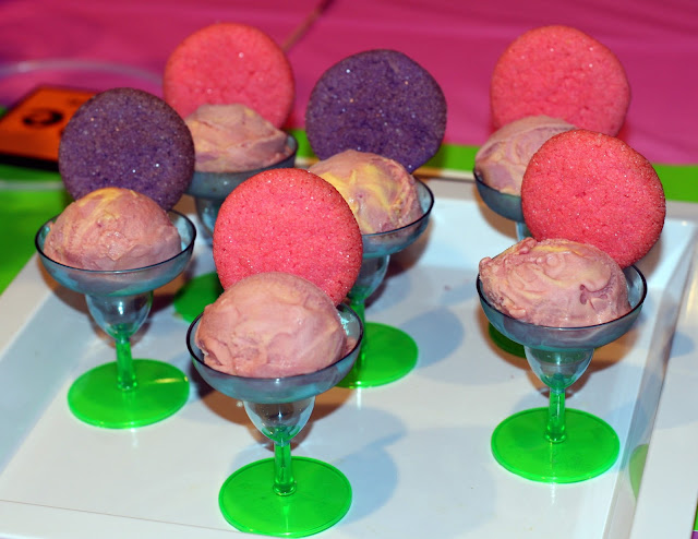 For dessert, I served rainbow sherbet in lime green and blue mini margarita glasses that I bought a long time ago from Party City. I also baked sugar cookies and used neon food coloring to dye them bright purple and pink.  Easy and good.