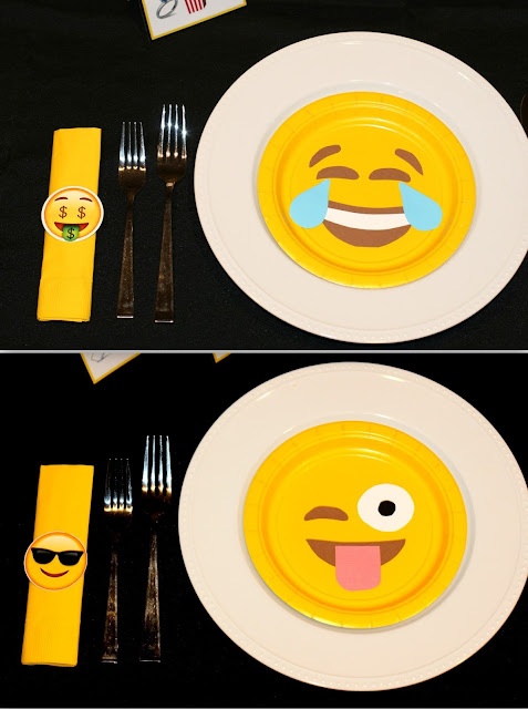 I cut out small emoji faces to glue to bright yellow folded napkins.  All the emojis for the party I found online.  Just a warning though, sometimes it was difficult to find large size emojis that weren't pixilated. Just  make sure you check them before you print.  Here's a photo of the entire place setting...