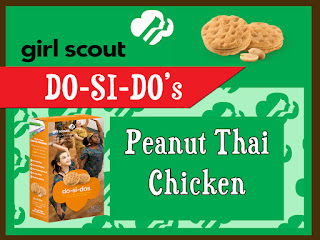For the main dish, I served Do-Si-Dos Peanut Thai Chicken. I didn't really have a recipe for this. I just brushed teriyaki glaze on chicken breasts and put them in the oven. I added a Thai Peanut sauce the last 10 or so minutes. After the chicken was tender and ready, I pulled them out, added a little more peanut sauce to the top and then sprinkled crushed up Girl Scout Do-Si-Dos to the top. I think I used about 8 cookies that I had crushed with a rolling pin.
