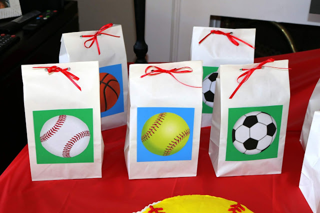 Favor: I bought white bags from Michaels and printed out basketballs, baseballs, softballs, and soccer balls to blue on the front with a colored background. Simple and easy.