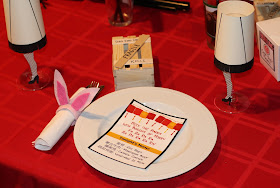 Check out these leg lamp wine glasses! I made these out of scrapbook paper and placed one at each place setting! The lamp shade was just lifted off when it was time to drink from them.
