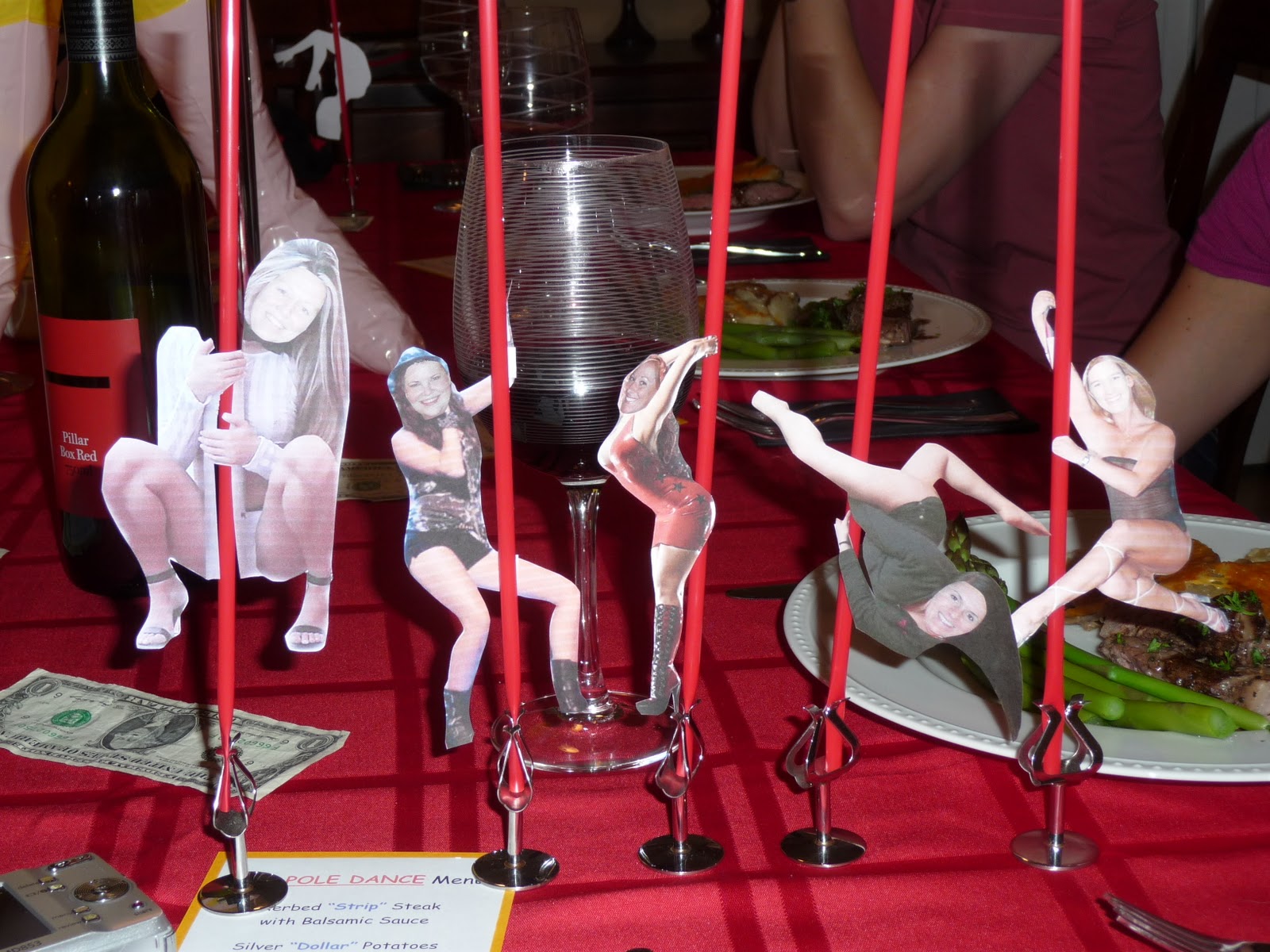 Oh, and let's not forget the placecards. I used bright red straws I "borrowed" from Jack in the Box and found images of strippers online. I cut out the strippers and glued them to the straw replacing the image's face with the face of a guest...so funny!!
