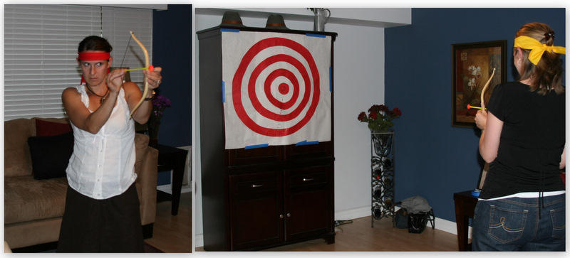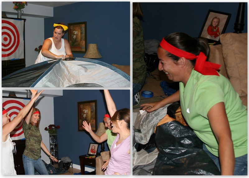 Challenge #2: Target Practice -- create a large target using butcher paper and red paint. Each team member must shoot a toy bow & arrow at the target. Two shots, best score counts. Team with highest score wins.Challenge #3: Tent Set-Up -- time which team can put up a tent the fastest