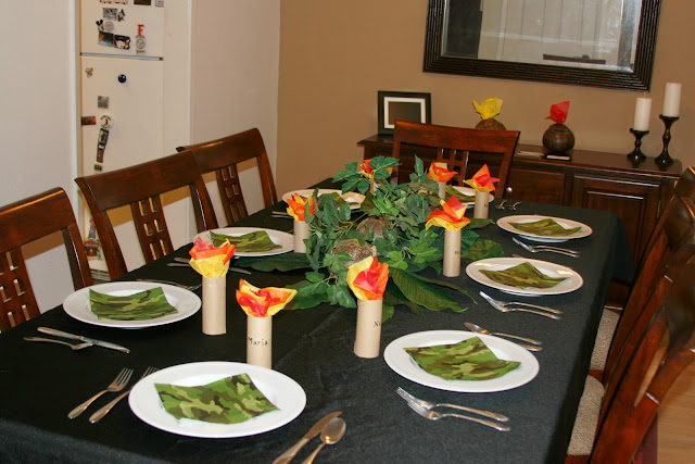 Decor: Set up tiki torches on the walkway leading up to your door. If you can get palm tree branches or other shrubbery, this just adds to it. As guests enter they are given a colored bandanna or strip of fabric to symbolize which team they will play on. I gave them out as guests arrived alternating colors, so the teams were random, and I wouldn't be accused of stacking my team with good players! My table was set using a black tablecloth and coconuts as the centerpiece. The coconuts are actually drinking cups I found at Party City which is where I also got the camouflage napkins. I also added leaves to the centerpiece to add more jungle theme. My place cards were handmade torches with each guest's name printed on them. I saved toilet paper rolls and covered them with the paper from brown paper lunch sacks. I then crumpled red, yellow, and orange tissue paper as a flame. The bottom of the flame was held together with safety pin. This gave guests something to grab a hold of when it was time to "extinguish" their flame (see activity section).