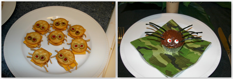 Food: Unfortunately, this is one of my parties that I cannot remember what my main menu was. I do, however, remember the appetizer and dessert. These were the only "bugs" allowed at this Survivor Soiree!! As an appetizer, I served spider crackers. I simply cut green olives into slices for the eyes and created a sandwich with cheese and Ritz crackers. I then used 8 Chinese noddles to represent the spider legs. The dessert was also a spider. I frosted cupcakes with chocolate frosting and made eyes by piping white frosting onto the cupcake. I used red hots as the eyeballs and cut thin black licorice into strips to use as the 8 legs. I looked everywhere for thin black licorice and finally found it at Sweet Factory.
