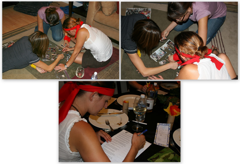 Challenge #4: Puzzle -- I created two puzzles each with a collage of photos from past monthly dinners. I just did mine on the computer and printed them on card stock. It was too much money to have them done professionally. Team that puts both puzzles together the fastest wins.